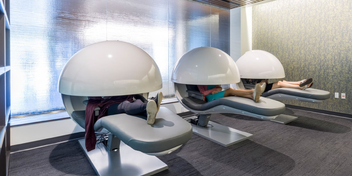 The Oasis has become widely popular on campus. The facility averages nearly 400 visitors on peak days during the week and typically logs more than 2,500 “nap pod” reservations per semester, offering a quiet space where students can recharge with a 45-minute power nap. It has hosted numerous workshops on topics such as mindfulness, yoga, art therapy, and meditation. “Response from students has been extremely positive,” says Francis. “Their general consensus is: ‘Where has this been? We needed this so much.’”